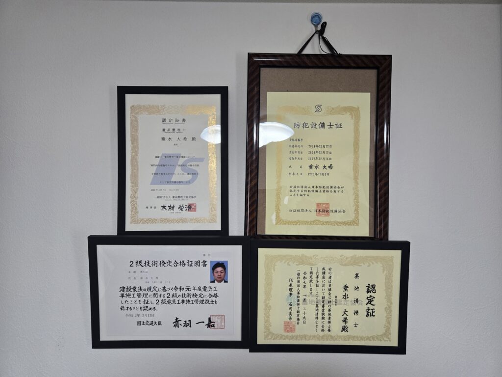 当店は、公益社団法人日本防犯設備協会認定 防犯設備士(資格者番号:第24-33367号) が在籍しており、専門知識を活かした適切な防犯対策をご提案します。